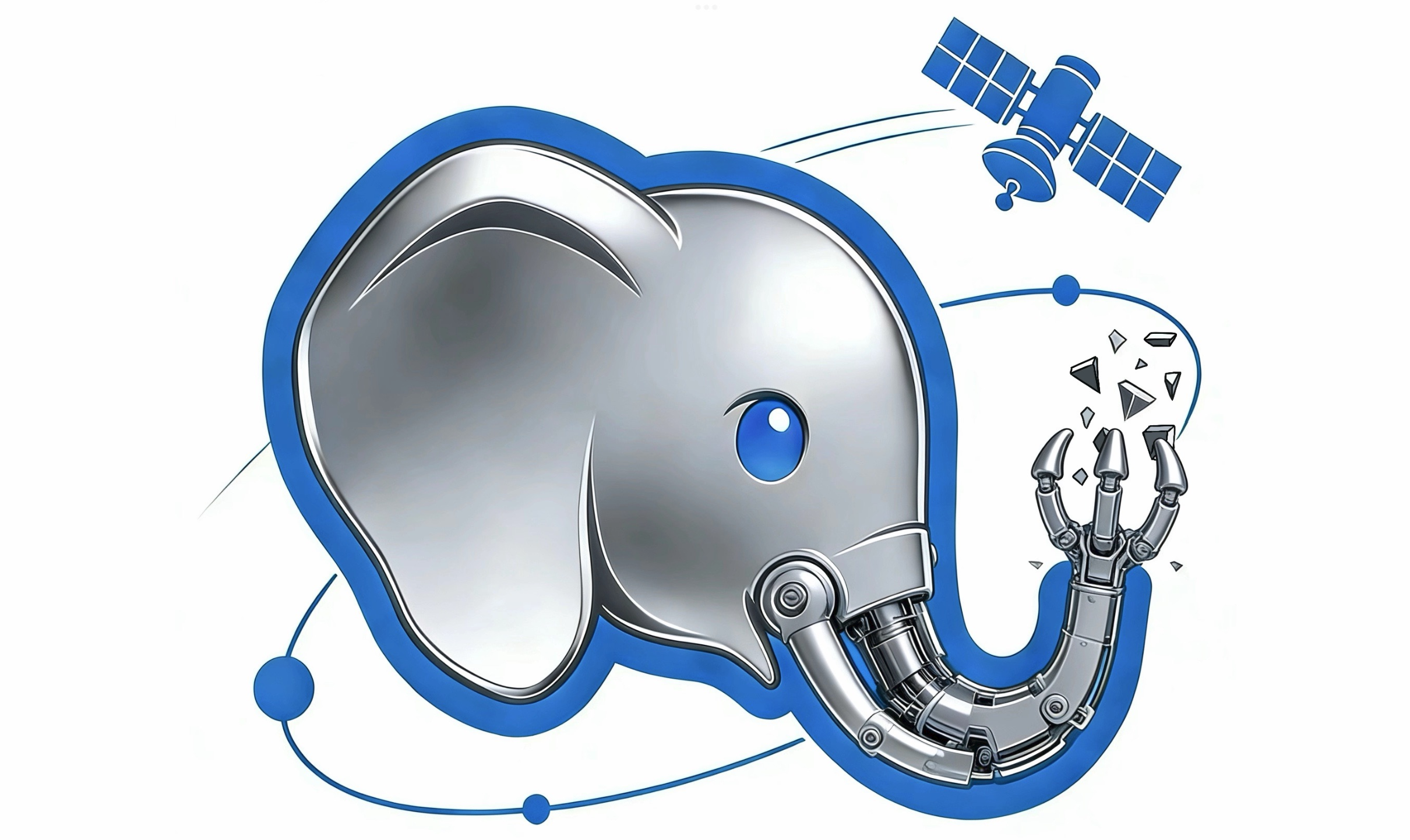 Clean, modern design of an elephant with its trunk catching space debirs and a satellite orbital path.